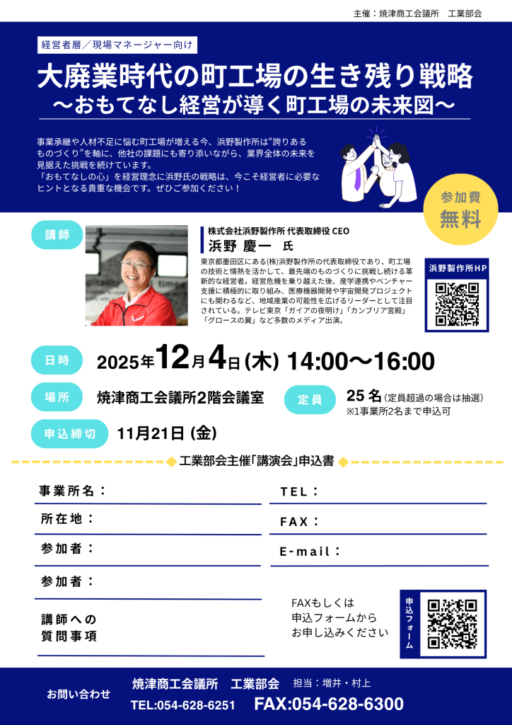 【問合せ先】焼津商工会議所 工業部会担当 TEL:054-628-6251 FAX:054-628-6300