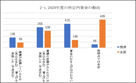 ・付帯調査「正社員における2020年度の賃上げの状況」では、前年調査時と比較すると、「賃上げを実施した」企業が58.6%→38.2%と大幅に減少した。そのうち「業績の改善が見られないが賃上げ(防衛的な賃上げ)を実施した」企業の割合が8割に迫る。